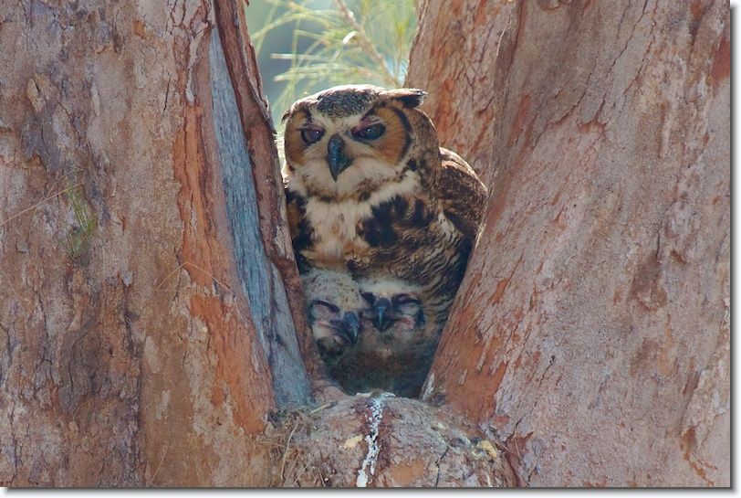 The female Great Horned Owl is blind in her left eye