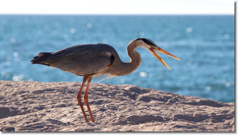 Comment: Great Blue Heron hunting in the sand for newly hatched sea turtles