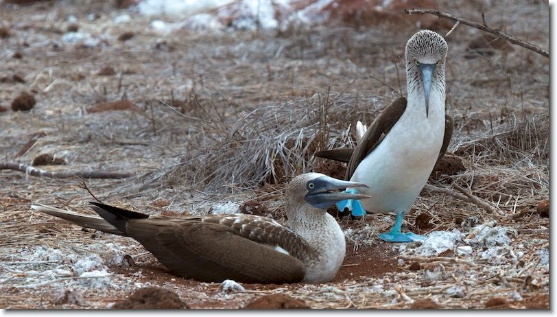 Blue-footed Booby, male on the right, female sitting on 2 eggs